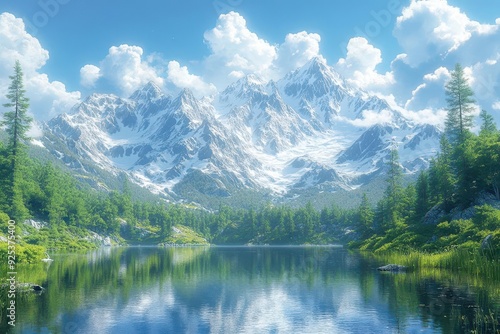 serene anime mountain scene majestic snowcapped peaks lush evergreen forest crystalclear lake reflecting sky soft pastel color palette sense of tranquility and wonder