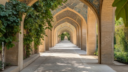 arch, pathway, serene, garden, greenery, lush, plant, tree, brick, stone, architecture, persian, islamic, design, paseo, column, passage, sunlight, shadow, leaf, vine, foliage, tranquil, peaceful, calm, quiet, ambience, atmosphere, ornate, detail, pattern, texture, light, shade, summer, day, outdoors, perspective, receding, line, symmetry, beauty, elegance, majestic