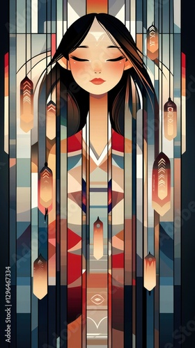 asian woman, woman, girl, female, portrait, illustration, art, digital artwork, graphic, design, geometric, abstract, pattern, line, shape, colours, red, orange, beige, blue, grey, black, calm, peaceful, serene, tranquil, meditative, spiritual, mystical, elegant, stylish, fashion, beauty, face, eyes closed, long hair, dark hair, kimono, dress, artwork, wallpaper, background