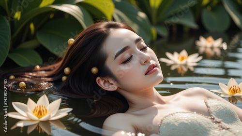 Serene Asian Woman Relaxing in Water with Lotus Flowers, Spa and Wellness Concept