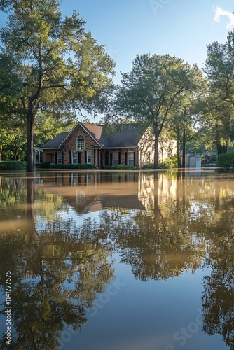 Serene Autumn Reflection of Cozy Wooden Cabin on Tranquil Lake in Countryside