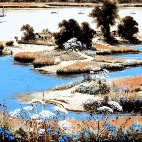 landscape, painting, water, island, grass, wildflower, blue, autumn, serene, tranquil, art, nature, peaceful, calm, sky, watercolor, stillness, view, scenery, artistic, creation, artwork, image, picture, illustration, visual, design, graphic, colours, palette, texture, composition, style, technique, masterpiece, fine, impressionist, pastoral, rustic, countryside, meadow, field, plant, flora, vegetation