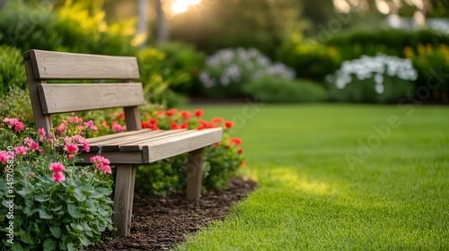 backyard, garden, bench, flower, nature, landscape, grass, foliage, greenery, relaxation, spring, summer, tranquil, wood, rustic, bloom, floral, red, pink, lush, serene, pathway, peaceful, scenic, cosy, verdant, idylli, inviting, contemplative