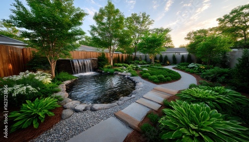 garden, duck pond, tree, landscaping, pathway, waterfall, plant, stone, design, relaxing, beautiful, tranquil, nature, zen, decorative, stone, water, green, calm