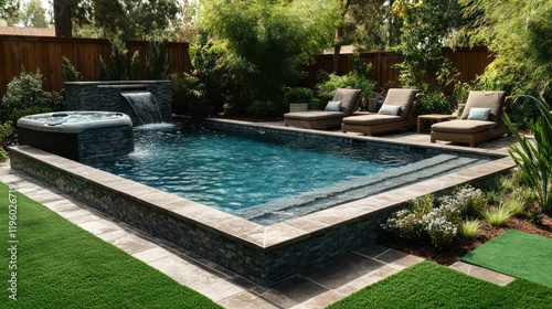 Serene Backyard Oasis: Modern Pool Design with Waterfall and Spa