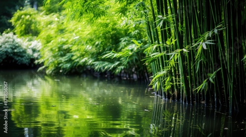 serene, bamboo, water, illustration, duck pond, lush, green, plant, still, reflective, mirroring, tall, stalk, harmony, balance, natural, environment, background, calmness, peaceful, calm, nature, foliage, zen, landscape, scenery, botanical, greenery, ecosystem