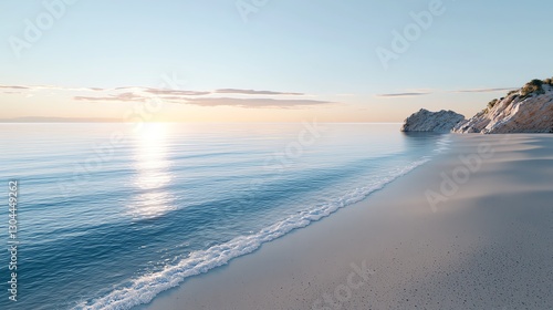 Serene beach at sunrise with gentle waves and clear blue waters against a calm horizon.