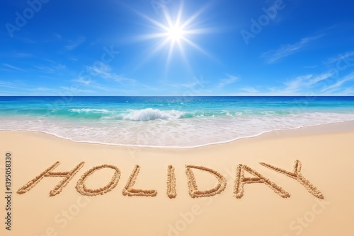 Serene Beach Scene Featuring the Word Holiday Written in Sand with Gentle Waves and Bright Sun to Evoke Relaxation and Joyful Vacation Vibes