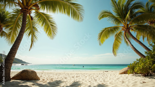 serene beach scene with palm trees, soft sand, and clear blue water creates tranquil atmosphere