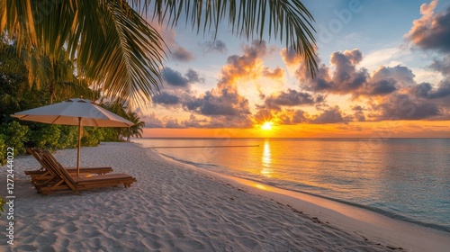 Serene beach sunset scene with sun loungers, umbrella, and palm fronds swaying in the breeze, soft white sand, and peaceful ocean stretching to the horizon. No people no text