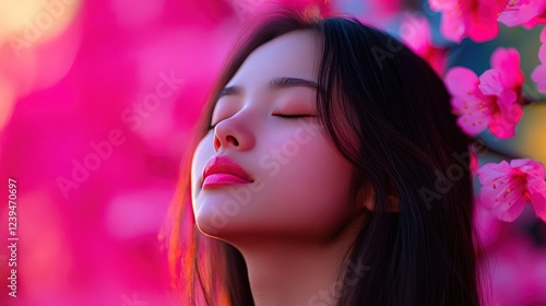 woman, girl, face, portrait, beauty, flower, pink, blossom, cherry, bloom, spring, peaceful, serenity, calm, tranquil, dreamy, soft, gentle, delicate, pretty, aesthetic, vibrant, colours, closeup, eye, lip, hair, skin, model, photo, image, digital, art, graphic, visual, artistic, style, illustration, design, nature, background