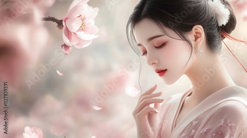 beauty, portrait, woman, cherry blossom, flower, pink, soft, serene, nature, spring, elegance, face, gentle, coiffure, peaceful, delicate, romance, art, aesthetic, composition, soft focus, calm, light, blossom, flower petals, background, feminine, calmness, style, fashion, graceful, natural, culture, joy, dreamy, charming, romantic, authentic, skin, elegant, artistic, radiant, harmony, closeup