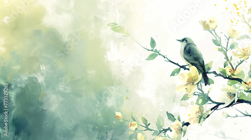 bird, tree branch, blossom, serene, nature, flora, fauna, tranquil, spring, art, illustration, botanical, wildlife, peaceful, artistic, floral, delicate, foliage, leaf, flower petals, vibrant, perched, calm, tranquil scene, elegant, stylish, creative