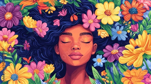 woman, flower, beauty, nature, peace, serenity, calm, hair, face, girl, pretty, floral, colourful, vibrant, bloom, blossom, flower petals, leaf, summer, spring, joy, happiness, relax, tranquil, feminine, portrait, illustration, art, design, style, graphic, digital, image, artwork, colours, dark, skin, eye, smile, expression, romantic, gentle, elegant, lush, blooming
