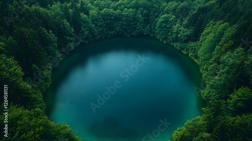 Serene blue lake surrounded by lush green forest, aerial perspective