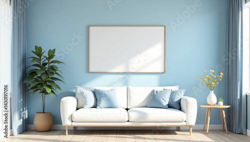 Serene Blue Modern Living Room with White Sofa and Minimalist Decor