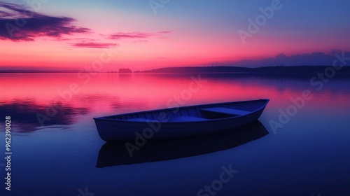 Serene Boat Silhouette at Dusk, a tranquil scene featuring a sleek boat outline gently resting on still water, bathed in the soft glow of a fading sunset.