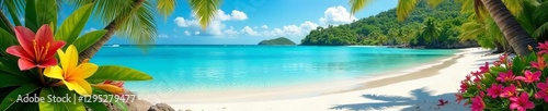 Serene Bora Bora beach, vibrant tropical flowers, turquoise water , beach, digital painting