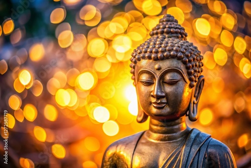 Serene Buddha Statue at Dusk, Warm Bokeh Lights, Peaceful Meditation