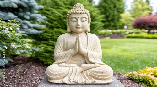 Serene Buddha Statue in Idyllic Garden Landscape with Tranquil Pond