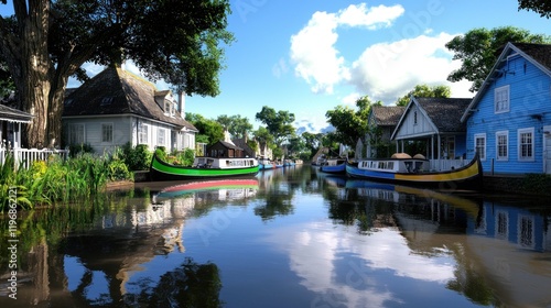 water, boat, house, canal, tree, sky, cloud, greenery, architecture, nature, calmness, landscape, travel, village, scenic, peaceful, environment, tour tourism, community, culture, summer, leisure, colourful, design, heritage, blue, rural, lifestyle, waterway, fishing, vacation, scenery, beauty, exploration, tradition, serenity, habitat, flora, fauna, recreation, sunlight, charme, picturesque, relaxation, journey, adventure