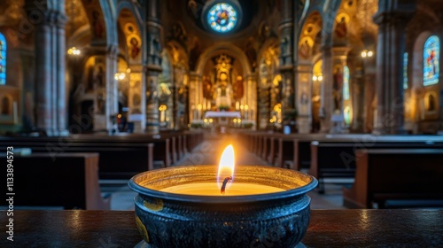 Serene Candle Flame in Majestic Church Interior With Stained Glass