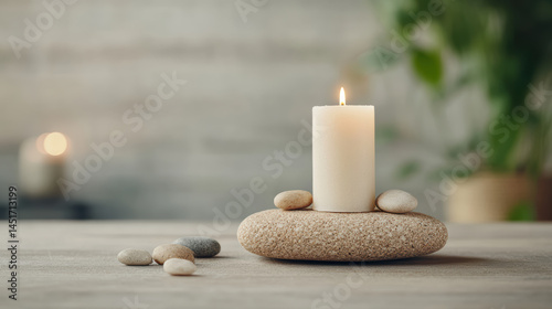 Serene candle on smooth stone, surrounded by pebbles, creates calming atmosphere