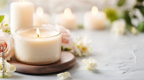 Serene candle with soft warm light surrounded by delicate roses on a textured surface : Generative AI