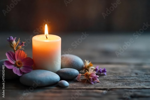 Serene Candlelight Illuminated Candle on Rustic Wood with Grey Stones and Dried Flowers, Evoking Inner Peace and Spiritual Awakening