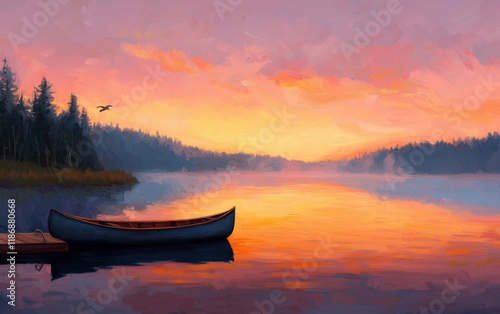 Serene Canoe Reflection at Dawn on Tranquil Lake with Colorful Sky