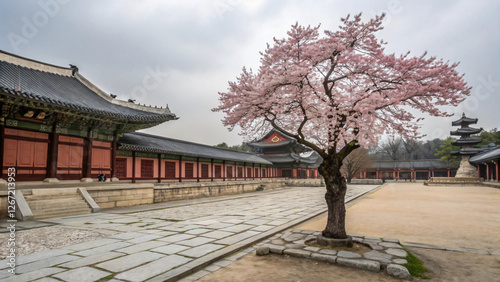 Serene Cherry Blossom Tree Amid Historic Architecture in Korean Palace Garden Under Soft Gray Sky