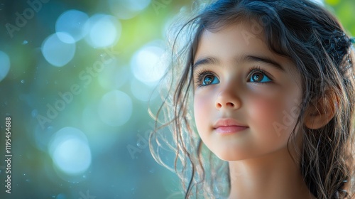 Serene Child Portrait with Long Hair and Bright Eyes Gazing Optimistically at the Outdoors Surrounded by Soft Blur and Natural Light in a Dreamy Setting