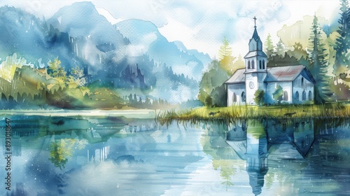 Serene church by a peaceful lake with a mountainous backdrop, surrounded by lush forest in a beautiful watercolor painting.