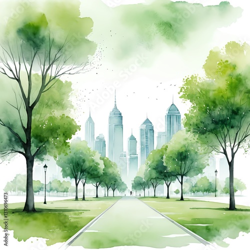 watercolor, city landscape, city, skyline, skyscraper, building, park, tree, green, leaf, grass, path, road, paseo, lane, street, summer, spring, nature, urban, landscape, tranquil, peaceful, serene, calm, quiet, perspective, modern, architecture, light