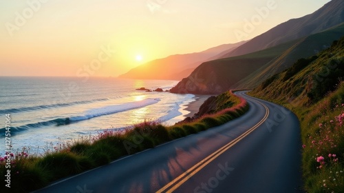 Serene Coastal Drive at Sunset A Winding Asphalt Road by the Ocean with Vibrant Wildflowers