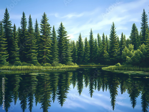 lake, tree, forest, nature, water, sky, cloud, landscape, summer, green, pine, fir, coniferous, digital, art, serenity, tranquil, peaceful, scene, view, blue, sunlight, ecosystem, environment, wood, evergreen, still, calm, mirror, image, scenic, picture, background, panorama, canvas, artwork, painting, graphic, illustration