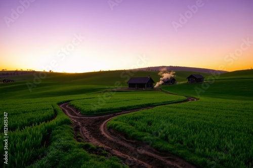 Serene Countryside Landscape at Dusk with Steaming Barns and Lush Green Rice Fields