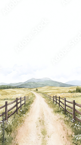 countryside, path, field, mountain, nature, peaceful, rural, timberland, farmland, scenic, landscape, meadow, horizon, sky, cloud, grass, tree, fence, dirt, road, summer, gentle, calm, tranquil, gold, warm, artistic, watercolor, view, green, brown, simple, beauty, quiet, charming, idylli, serene, rustic, outdoors