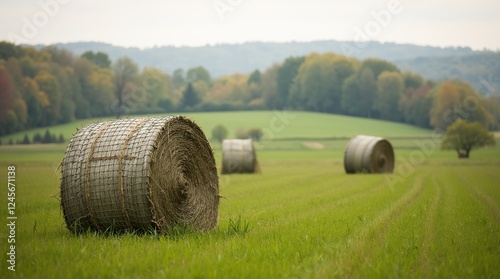 hay, hay bale, field, countryside, rural, farm, agriculture, landscape, nature, grass, green, scenery, meadow, rustic, peaceful, outdoors, harvest, autumn, pasture, tree, rolling hills, idylli, crop, netting, serene, tranquil, sunlight, background, horizon, open space, organic, vegetation, fertile, farming, scenic, crop