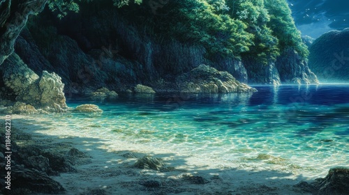 secluded, cove, beach, ocean, rock, cliff, tranquil, serene, peaceful, calm, water, clear, turquoise, teal, blue, green, shadow, sunlight, tree, foliage, lush, vegetation, natural, landscape, scenic, idylli, hidden, mystery, evening, night