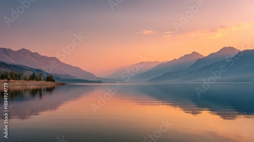 Serene Dawn at Calm Lake with Mountain Reflections Under Soft Morning Light