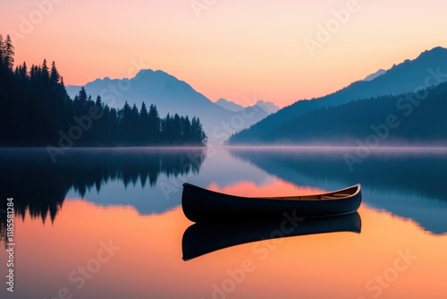 Serene Dawn Reflection of Canoe on Tranquil Mountain Lake