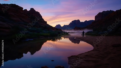 desert, dawn, sunrise, twilight, water, calm, still, mountain, rock, canyon, landscape, nature, scenery, hiking, figure, silhouette, person, outdoors, travel, adventure, tranquil, peaceful, vista, serenity, horizon, colours, vibrant, hue, colours, light, mist, fog, stream, creek, vale, beauty, wanderer, exploring, journey, photo, moment, gold, purple, orange, red