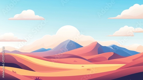 desert, mountain, landscape, hill, sand, dune, sky, cloud, sun, horizon, nature, scenery, vista, view, panorama, background, illustration, artwork, art, graphic, digital, design, aesthetic, calm, serene, peaceful, tranquil, quiet, still, colours, vibrant, hue, shades, tone, pastel, warm, summer, day, bright