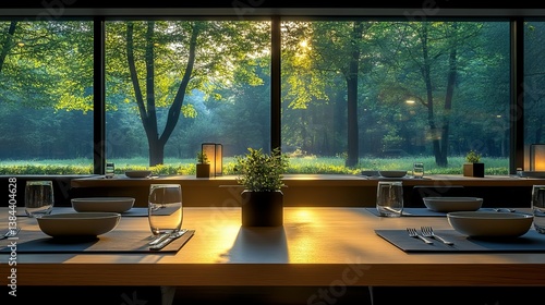 dining room, dining table, sunlight, nature, forest, tranquil, window, table setting, room, nature scene, cosy, luxury, elegant, table, setting, tableware, glasses, place setting, modern, interior, decoration, design, view, tree, bright, peaceful, relaxing, green, serene, scenic, contemporary, minimalism, minimalist, indoor, daytime, natural light, dining, meal, eatery, eating, leisure