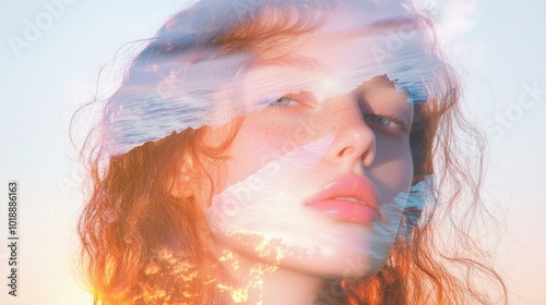 double, exposure, portrait, woman, flowing, hair, serene, ocean, sunrise, realistic, illustration, captivating, peace, calmness, beauty, merging, detailed, digital, art, artistic, creative, nature, harmony, meditation, surreal, peaceful, relaxation, calmness, tranquil, vibe, aethereal