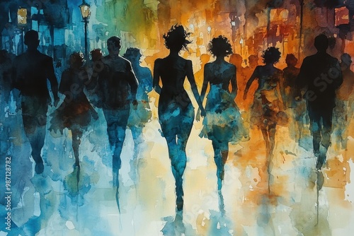 figure, standing, glacé, movement, gentle, detail, watercolor, style, serene, elegance, timeless, moment, party, celebration, art, painting, stillness, atmosphere, grace, fluidity, colours, ambience, calm, calmness, aethereal, dreamy, beautiful, artistic