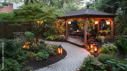 gazebo, garden, backyard, landscaping, outdoor lighting, lantern, pathway, patio, evening, night, twilight, summer, relaxation, calmness, peaceful, serene, romantic, cosy, flower, plant, tree, shrub, greenery, table, chair, seating, garden design, home decor, landscape design, illuminated, ambience, mood, atmosphere