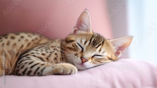 cat, kitten, animal, felino, pet, cute, lounging, resting, sleeping, pastel, minimalist, pink, surface, ambient, lighting, watercolor, brushwork, hazy, contemporary, japanese, aesthetic, studio, setting, furry, cosy, content, relaxed, peaceful, delicate, wispy