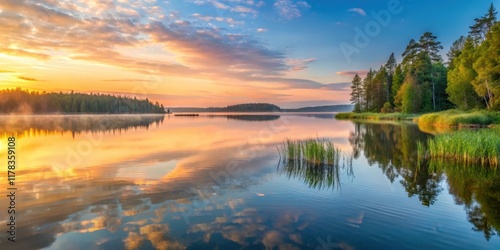 Serene Finnish lake scenery at sunrise, lakeside, summer water scenery , lakeside
